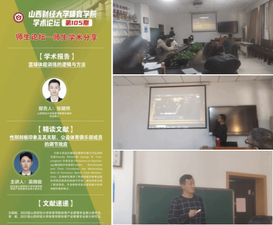 青年博士教师张建辉老师做学术分享,2022级体育产业管理专业硕士研究生吴晓俊同学做文献精讲,2022级体育产业管理专业硕士研究生王聪聪同学进行文献速递。学院中青年教师杨建海、许磊、胡荣光、樊哲昀和薛鹏飞以及全体研究生参与研讨与交流。学院学科和研究生办公室主任王雁副教授主持论坛。