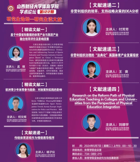 5月7日上午,多瑙影院 学术论坛第一百二十二期研究生论坛——研究生读文献在多瑙影院 会议室举办。本次论坛由2022级体育产业管理专业硕士研究生孟祺同学与2023级何文辉同学进行文献精讲,2022级王爽同学、2023级杨子仪、付芳芳、刘德宇同学进行文献速递。多瑙影院 全体研究生通过线上与线下相结合的方式参与研讨与交流,许磊老师主持论坛。