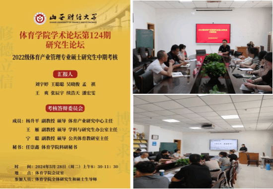 硕士研究生培养质量进行了严格的把关与检测。对参加考核的硕士研究生的培养计划履行情况、学科专业知识水平、学科科研与创新综合能力、学位论文开题报告完成情况与质量以及现有科研成果等具体方面进行了全方位、多角度、高层次的考核。8名硕士生围绕以上几个方面内容进行了个人汇报,考核小组对各位硕士生掌握本学科基础理论、研究方法、本领域研究现状和发展趋势给予了针对性指导。经汇报提问答疑环节后,考核组对8位同学的汇报表现进行了考评总结,同学们悉数通过本次中期考核,2022级体育产业管理专业硕士研究生中期考核工作顺利结束。