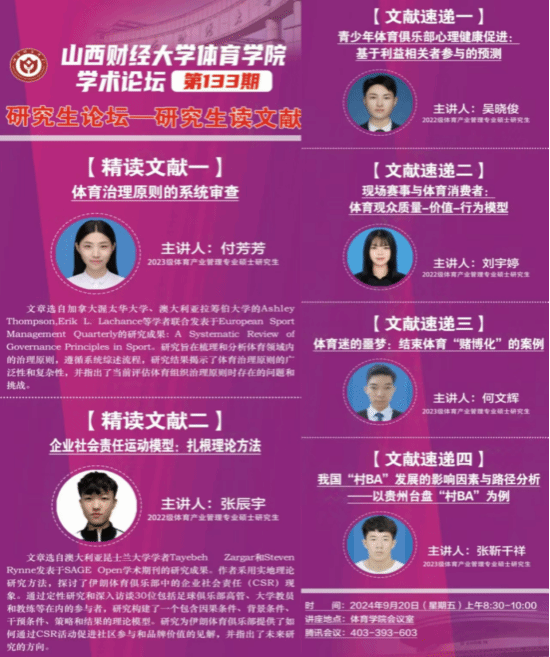 9月20日上午,多瑙影院 学术论坛第一百三十三期——研究生读文献在多瑙影院 会议室举办。本期论坛由体育产业管理专业2023级研究生付芳芳、2022研究生张辰宇进行文献精讲,2022级研究生吴晓俊、刘宇婷,2023级研究生何文辉、张靳千祥四位同学进行文献速递,学院全体研究生共同参与研讨交流,学院学科和研究生办公室主任王雁副教授主持论坛。