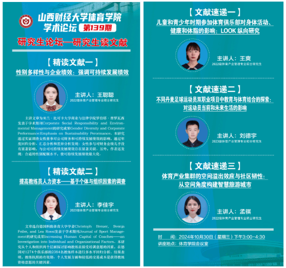 10月30日下午,多瑙影院 学术论坛第一百三十九期——研究生读文献在多瑙影院 会议室举办。本期论坛由体育产业管理专业2022级研究生王聪聪、2023级研究生李佳宇进行文献精讲,2022级研究生王爽、2023级研究生刘德宇两位同学进行文献速递,学院全体研究生共同参与研讨交流,学院学科和研究生办公室主任王雁副教授主持论坛。