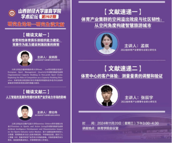 会议室举办。体育产业管理专业2024级吴炳霖、2023级席壮伟两位同学为大家汇报文献精讲,2022级孟祺、张辰宇两位同学进行文献速递。学院全体研究生共同参与研讨交流,学院学科和研究生办公室主任王雁副教授主持论坛。