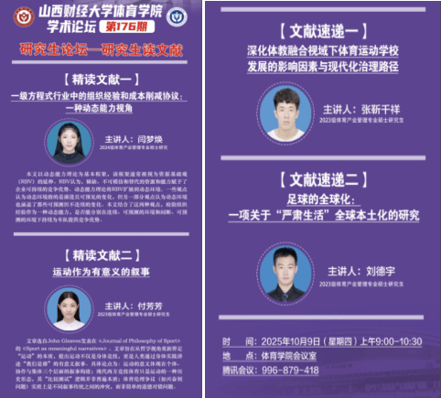 会议室举办。本期论坛由体育产业管理专业2024级研究生闫梦焕、2023级研究生付芳芳进行文献精讲,2023级研究生张靳千祥、2023级研究生刘德宇进行文献速递,学院全体研究生参与研讨,学院学科和研究生办公室主任王雁副教授主持论坛。