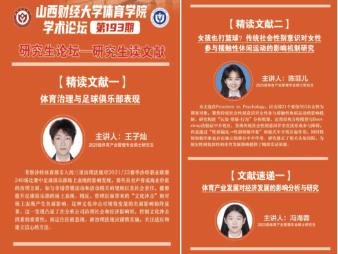 第193期学术论坛——研究生读文献活动在学院会议室及线上同步举行。本期论坛聚焦体育治理、性别平等、体育经济等前沿议题,由2025级研究生王子灿、陈菲儿进行文献精讲,2025级研究生冯海蓉进行文献速递。学院全体研究生积极参与研讨,现场交流深入,学术氛围浓厚,学院学科与研究生办主任王雁副教授主持活动。