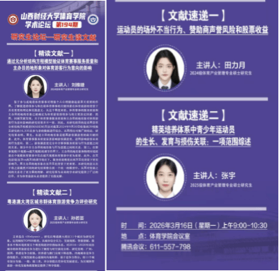 2024级研究生田力月就文献《运动员的场外不当行为、赞助商声誉风险和股票收益》作专题速递报告。该研究深入剖析运动员场外负面行为对赞助商声誉及资本市场产生的连锁反应,系统阐述风险传导机制与应对策略,为体育赞助领域声誉风险管理及企业投资决策提供了理论依据与实践参考,丰富了体育产业风险研究的学术内涵。2025级研究生张宇汇报了《精英培养体系中青少年运动员的生长、发育与损伤关联:一项范围综述》的成果。该研究全面梳理精英培养体系下青少年运动员生长发育与运动损伤的内在联系,总结年龄、训练负荷等关键影响因素,为青少年运动员科学训练、损伤预防与健康管理提供了实证支撑,对推动青少年体育人才培养精细化发展具有重要学术价值。