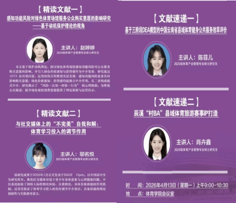 会议室顺利举办。本次论坛围绕绿色体育场馆、青少年体育、县域体育服务、体育旅游IP等前沿议题分享研究成果,2024级研究生赵婷婷、2025级研究生邬名悦进行文献精讲,2025级研究生陈菲儿、2024级研究生肖卉鑫进行文献速递。全体研究生共同参与,现场交流研讨深入充分,整体学术氛围浓郁,会议由学院学科与研究生办公室主任王雁副教授主持。
