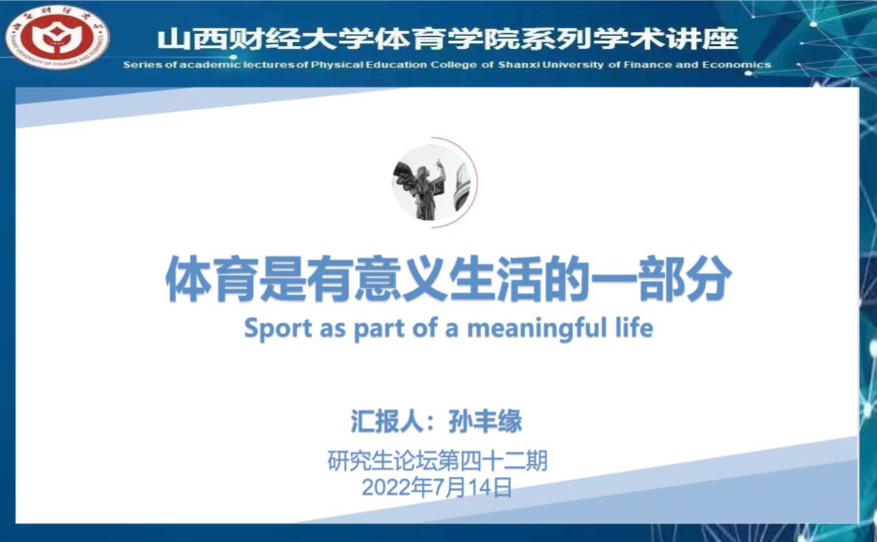 孙丰缘同学所分享的文章主题为“运动是有意义生活的一部分”,主讲文章为挪威体育科学学院体育和社会科学研究所学者GUNNAR BREIVIK的《SPORT AS PART OF A MEANINGFUL LIFE》,来自《JOURNAL OF THE PHILOSOPHY OF SPORT》期刊,文章讨论了有关体育运动的意义的辩论和关于体育运动的道德品格。