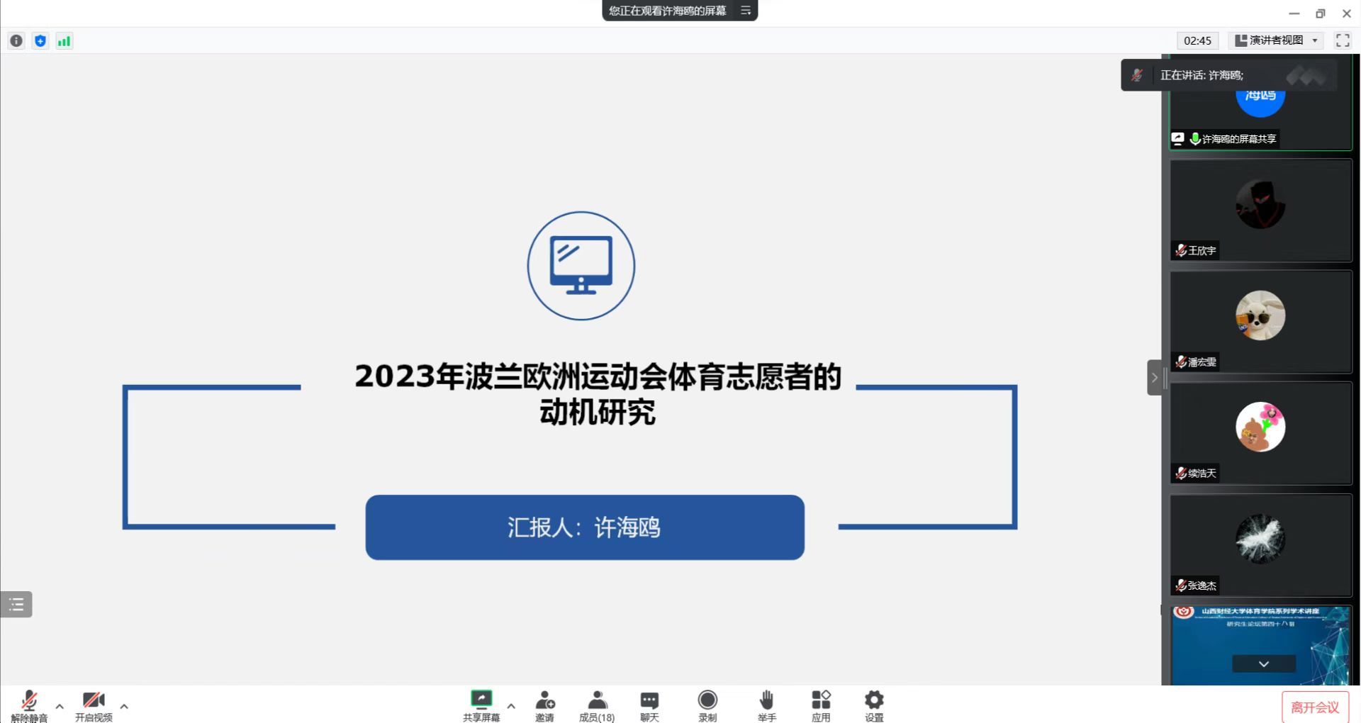 研究生论坛第四十九期通过线上腾讯会议顺利举行。本次论坛由2021级体育产业管理专业研究生许海鸥和李璐同学分享文献阅读情况,赵佳雯同学主持会议,参与本次论坛的有多瑙影院