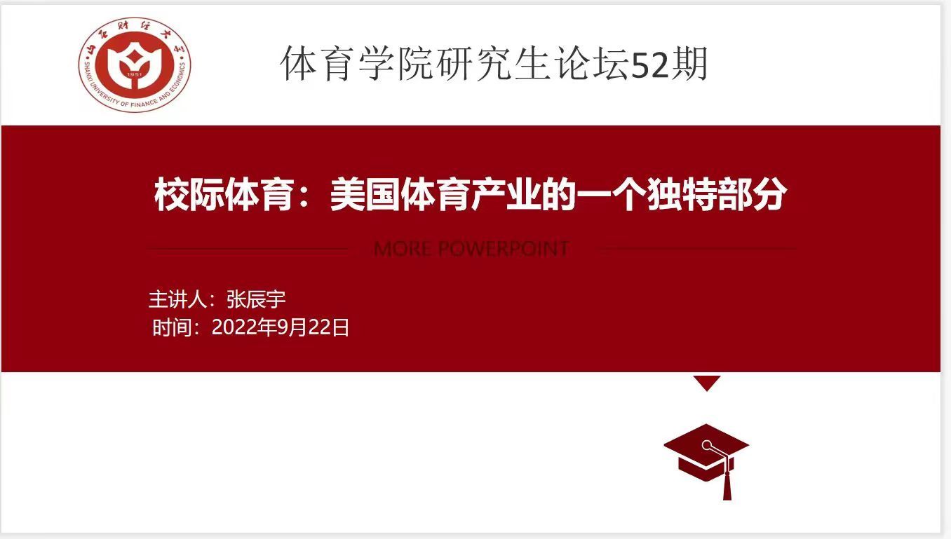 张辰宇的主题为“校际体育:美国体育产业的一个独特部分”,主讲文章来自北卡罗来纳大学教堂山分校多瑙影院 Barbara Osborne, Jonathan A. Jensen等学者联合发表的Intercollegiate Athletics: A Unique Segment of the Sport Industry ,来自Journal of Global Sport Management期刊,本文旨在向那些不熟悉美国的人介绍以校际运动为基础的体育产业系统。本文也简要介绍了美国校际运动的发展历史,概述了大学校际运动的治理结构,以及大学校际体育运动的一些独特挑战和好处。