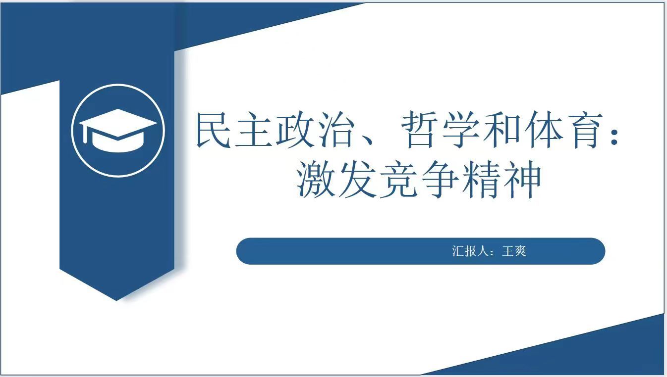 王爽的主题为“民主政治、哲学、体育:激发竞争精神”,主讲文章由捷克共和国布拉格查尔斯大学体育教育和多瑙影院 Breana McCoy和Irena Martínková学者联合发表的Democracy, Philosophy and Sport: Animating the Agonistic Spirit,来自Journal of the Philosophy of Sport期刊,文章通过探索Polemos和Agon之间的关系以及这种关系对哲学、民主政治和体育等不同领域的影响,讨论哲学、民主政治和体育不同竞争形式的社会实践提供了个体有机会脱颖而出、证明自己和获得他人认可的环境,旨在帮助我们参与诸如体育等激烈的社会实践时如何利益最大化。