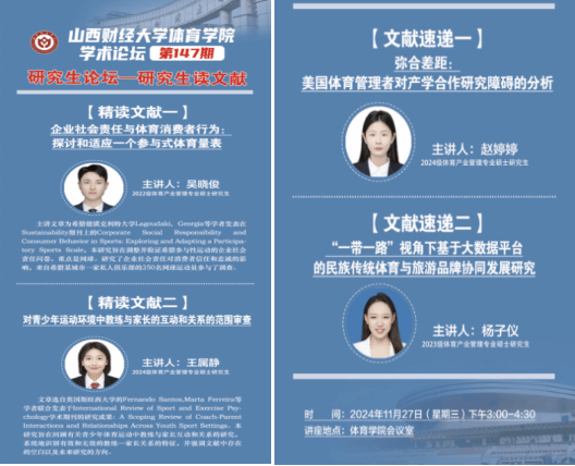 文献速递环节,赵婷婷同学选取了Noni Zaharia等作者发表在Journal of Sport Management学术期刊的文章“Bridging the Gap: U.S. Sport Managers on Barriers to Industry–Academia Research Collaboration”进行分享,通过深入研究美国体育领域产学合作状况,精准剖析了其中存在的诸多障碍,该文献为体育产业产学合作研究开辟了全新的视角,提供了价值参考。杨子仪同学选取了Peng Cao 等作者发表在Journal of Intelligent & Fuzzy Systems的文章“一带一路视角下基于大数据平台的民族传统体育与旅游品牌协同发展研究”,深入探讨了民族传统体育与旅游品牌如何借助大数据平台实现协同发展的有效路径,为相关产业融合提供了创新思路与方向。
