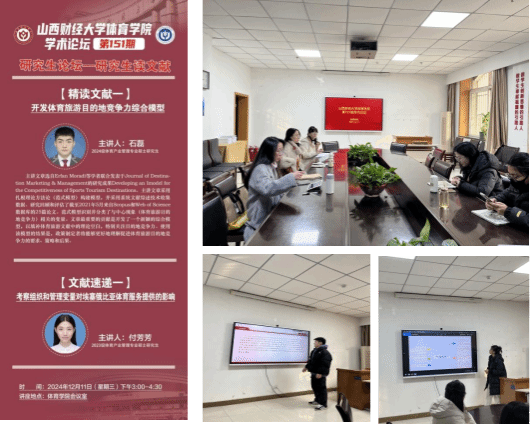 会议室举办。本期论坛由体育产业管理专业硕士研究生2024级石磊同学进行文献精讲、2023级付芳芳同学做文献速递。学院学科和研究生办公室主任王雁副教授主持论坛,全体研究生共同参与研讨交流。