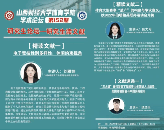 精读文献环节,刘雅婕同学聚焦电子竞技,汇报的是美国 Pizzo,Anthony D等研究的“电子竞技性别多样性:休闲约束视角”,通过介绍休闲约束的分层模型,来解释是什么限制了个人从事休闲追求相关的积极行为。并指出女性电竞参与者的人际和内省约束明显更高。这可能会影响她们在电竞及相关领域工作的愿望,从而解释了电竞高层中缺乏女性代表的原因。田力月同学则以美国学者Jamal A. Mckenzie的“体育大型赛事‘遗产’的构建与争议意义:以2022年伯明翰英联邦运动会为例”为题,以2022年伯明翰英联邦运动会(CWG)为切入点,介绍了大型赛事场域中的主导行为者将相当一部分赛前遗产构建为与主办城市的本地社区、劳动力和志愿服务实践相关的无形包容性遗产。理论上在新背景下剖析了布尔迪厄的“场域”和“正统观念”。
