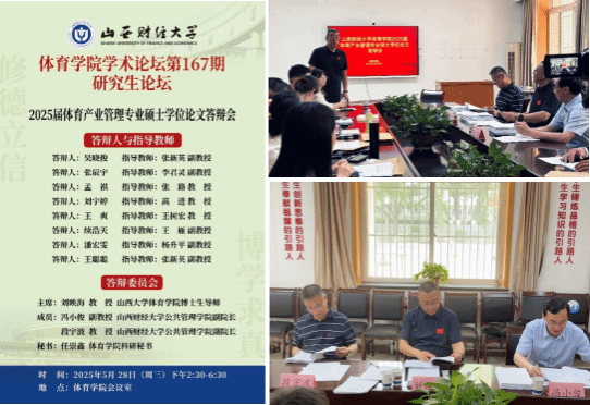 学术论坛第167期暨2025届体育产业管理专业硕士学位论文答辩会在学院会议室成功举行。学院全体研究生导师、部分任课教师及全体研究生参加了本次答辩,答辩会由学院学研办主任王雁主持。答辩会上,毕业生经过个人陈述、评委提问、答辩委员会评议和投票表决,8名2025届毕业生全部通过答辩。