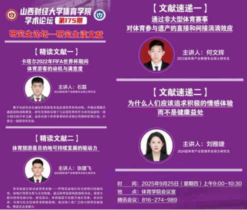 第175期学术论坛暨研究生读文献活动在学院会议室成功举办。本次活动以“体育赛事与旅游的多重效应及可持续路径探析”为主题,聚焦大型与非大型体育赛事对旅游与参与遗产的影响,探讨体育旅游在可持续发展中的价值,并关注人们在体育活动中对情感体验与健康益处的追求。活动由学院学科与研究生办公室主任王雁副教授主持,全体研究生共同参与,现场学术氛围浓厚、思维碰撞频频。