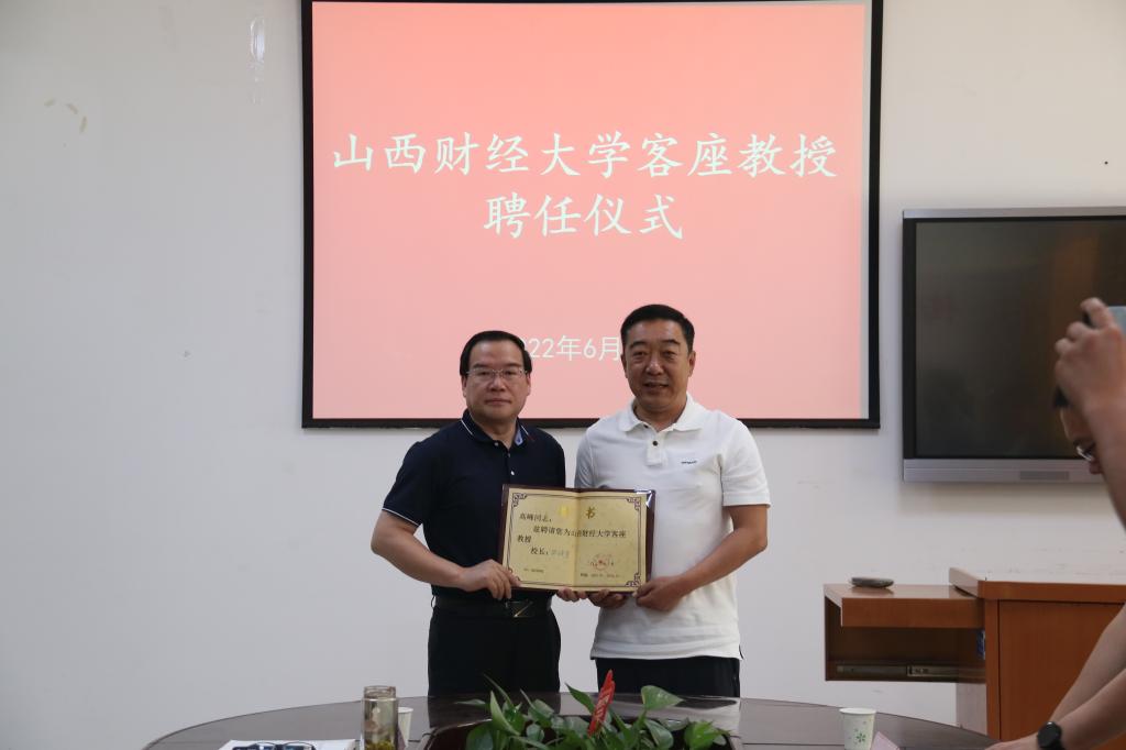 客座教授聘任仪式上,党委书记丁耀武向高峰董事长颁发了“多瑙影院