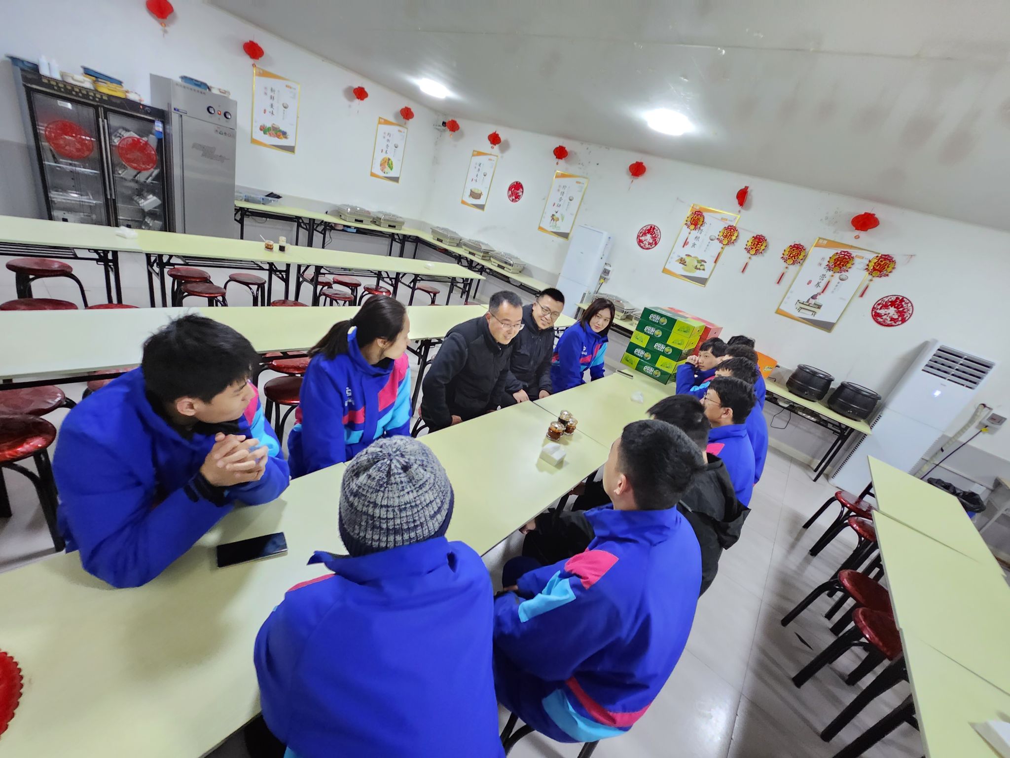 2月8日,李群生一行参观了实习基地的员工宿舍楼和餐厅,代表学院为实习生们赠送了慰问品,送上了新年祝福。晚餐后,与实习生一起座谈,畅聊实习收获和心得,重点询问了实习生住宿、吃饭、安全、工作、专业实践等情况;嘱咐大家时刻做好个人健康和安全防护,在实习期间认真完成好本职工作,做好实习日记和实习结束前的复盘总结。大家一致表示,公司提供了良好的食宿保障,通过实习提升了个人专业技能、锻炼了意志品质,加强了对专业理论知识的理解和运用能力,体会了从一名学生成长为职业教练的心路历程。