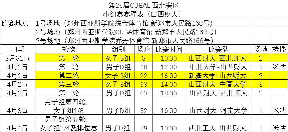 第25届CUBAL 西北赛区小组赛赛程表(山西财大)