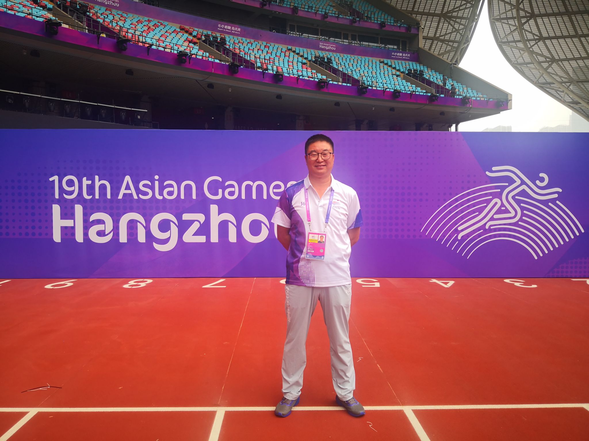张勇老师,田径项目国家级裁判,兼任我省田径裁委会主任,曾经执裁1次世锦赛、1次世界大学生运动会、2次亚运会、2次亚洲锦标赛、2次全运会。本次亚运会担任田径比赛的裁判工作,主要执裁全部比赛项目的检录工作。